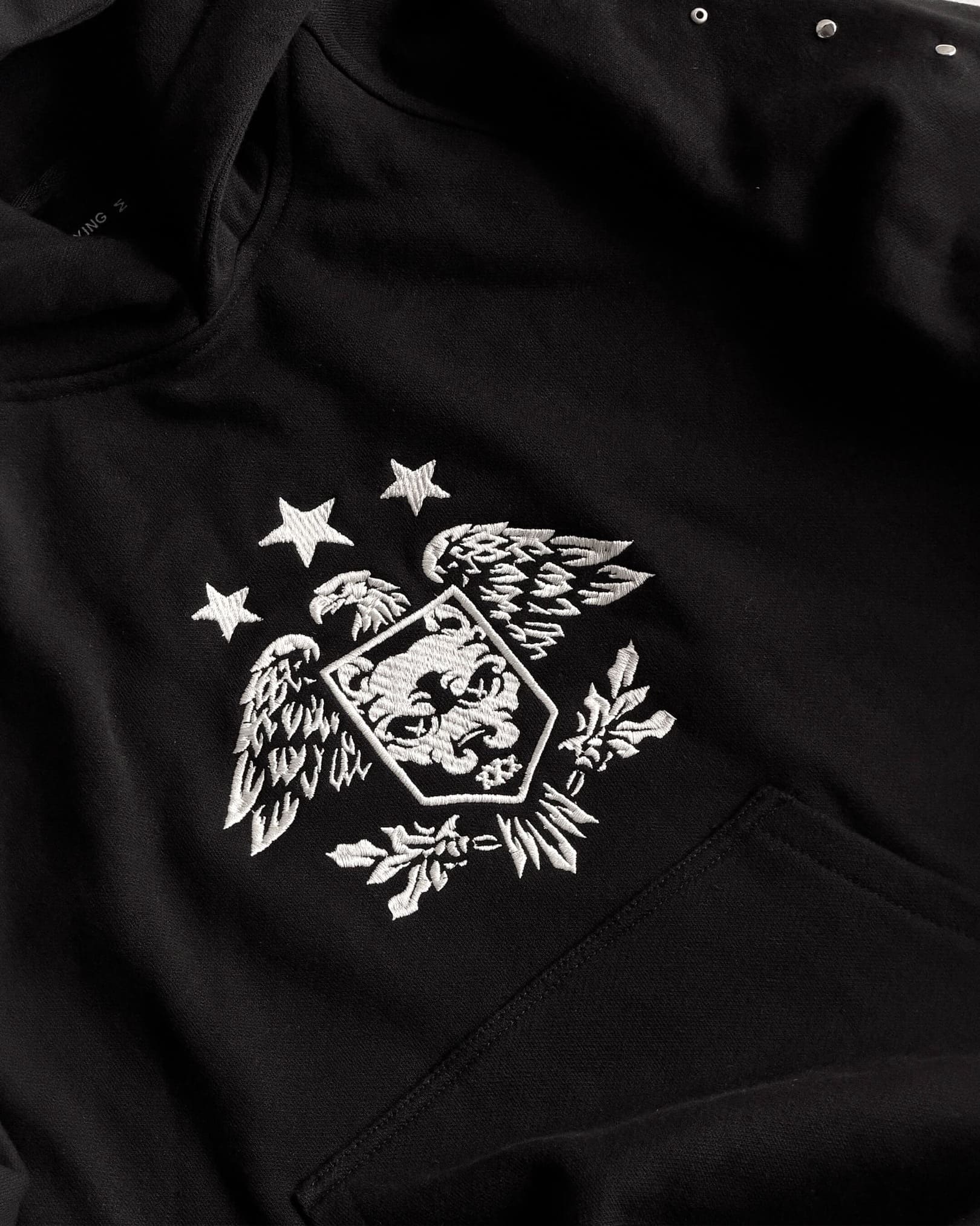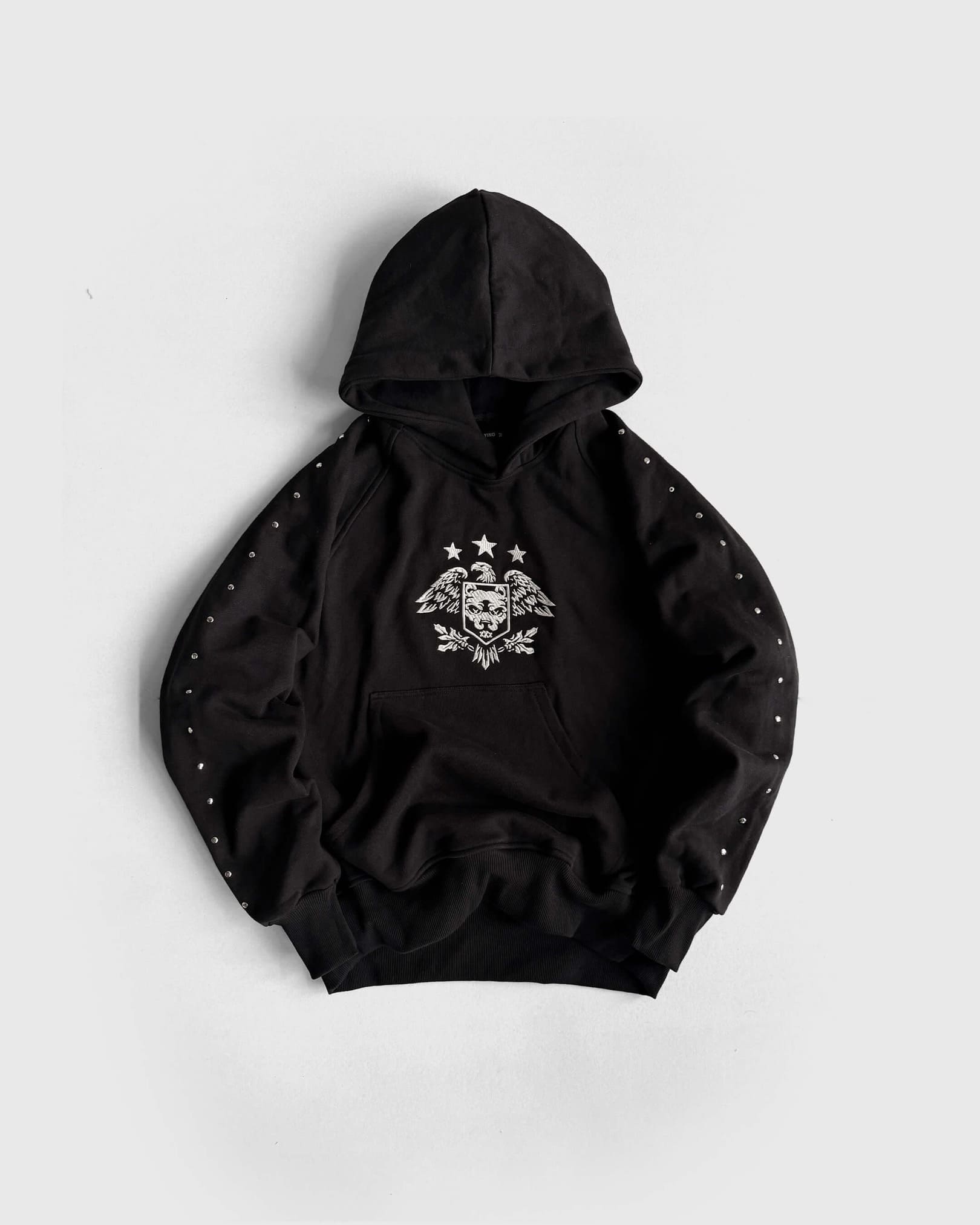 Hoodie de corte oversize con capota estructurada y bolsillo tipo canguro frontal. Confeccionado en algodón de alto gramaje para una estructura sólida. Destaca por sus remaches metálicos a lo largo de las mangas y un gráfico bordado del escudo en el centro del pecho.